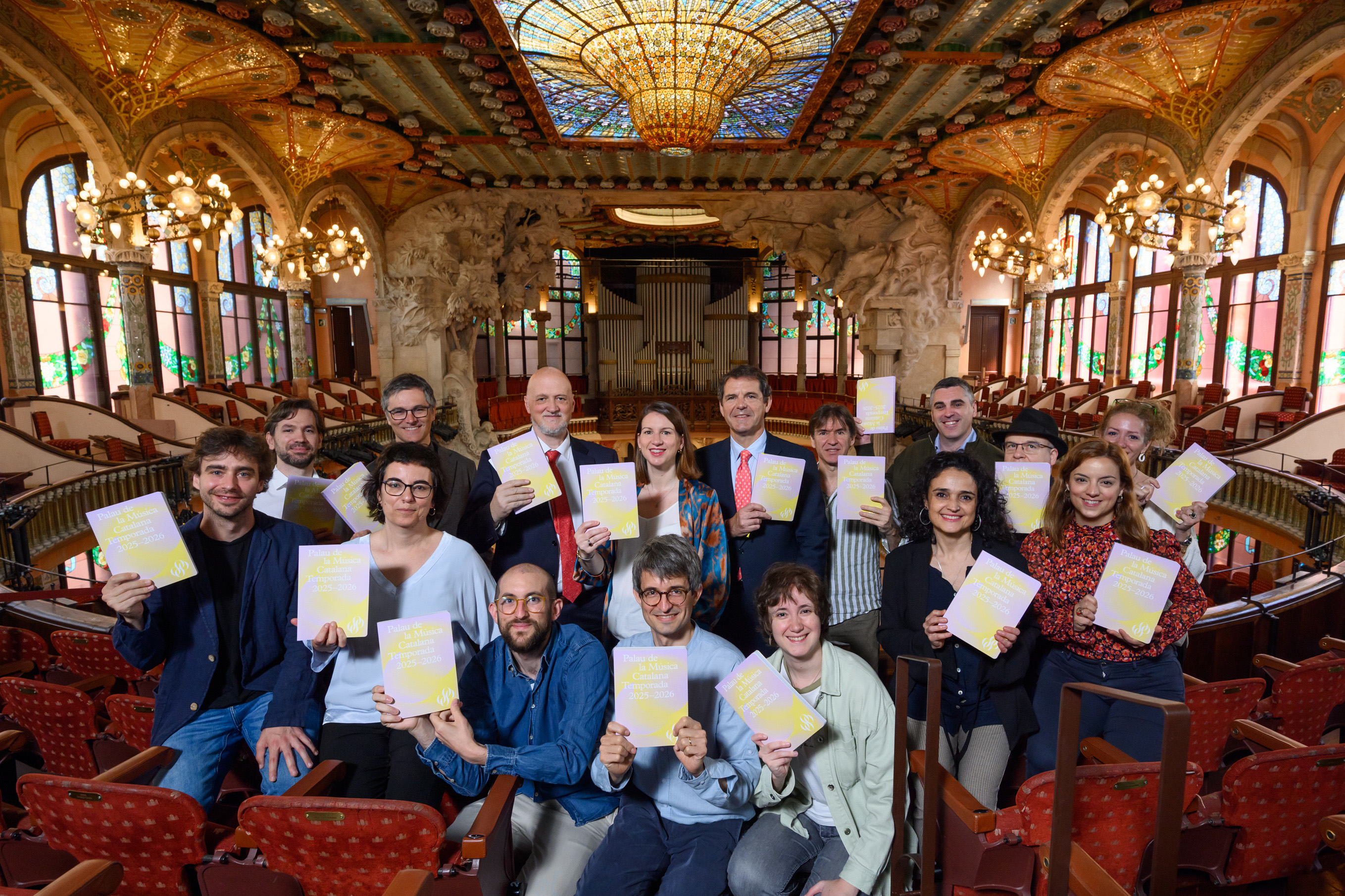 Podéis descargar en los siguientes enlaces las fotos de familia de la presentación: aquí de izquierda a derecha Joan Oller, director general del Palau de la Música Catalana; Mercedes Conde, directora artística adjunta del Palau; y Joaquim Uriach, presidente del Palau de la Música Catalana; y aquí de izquierda a derecha y de atrás hacia delante, fila trasera: Marc Heredia (Trio Fortuny), Dani Espasa (Vespres d’Arnadí), Joan Oller, Mercedes Conde, Joaquim Uriach, Xavier Puig (director del Cor de Cambra del Palau), Pablo Larraz (director del Orfeó Català), Jordi Cos (intérprete y presidente de la OSV), Maria Ibarz (gerente de los coros del Orfeó Català), Pau Codina (Trio Fortuny), Montse Meneses (directora del Cor de Noies del Orfeó Català), Miquel Vich (Frames Percussion), Josep Ollé (compositor invitado de la temporada) y Belén Clemente (Beca Lluís Millet del Palau).